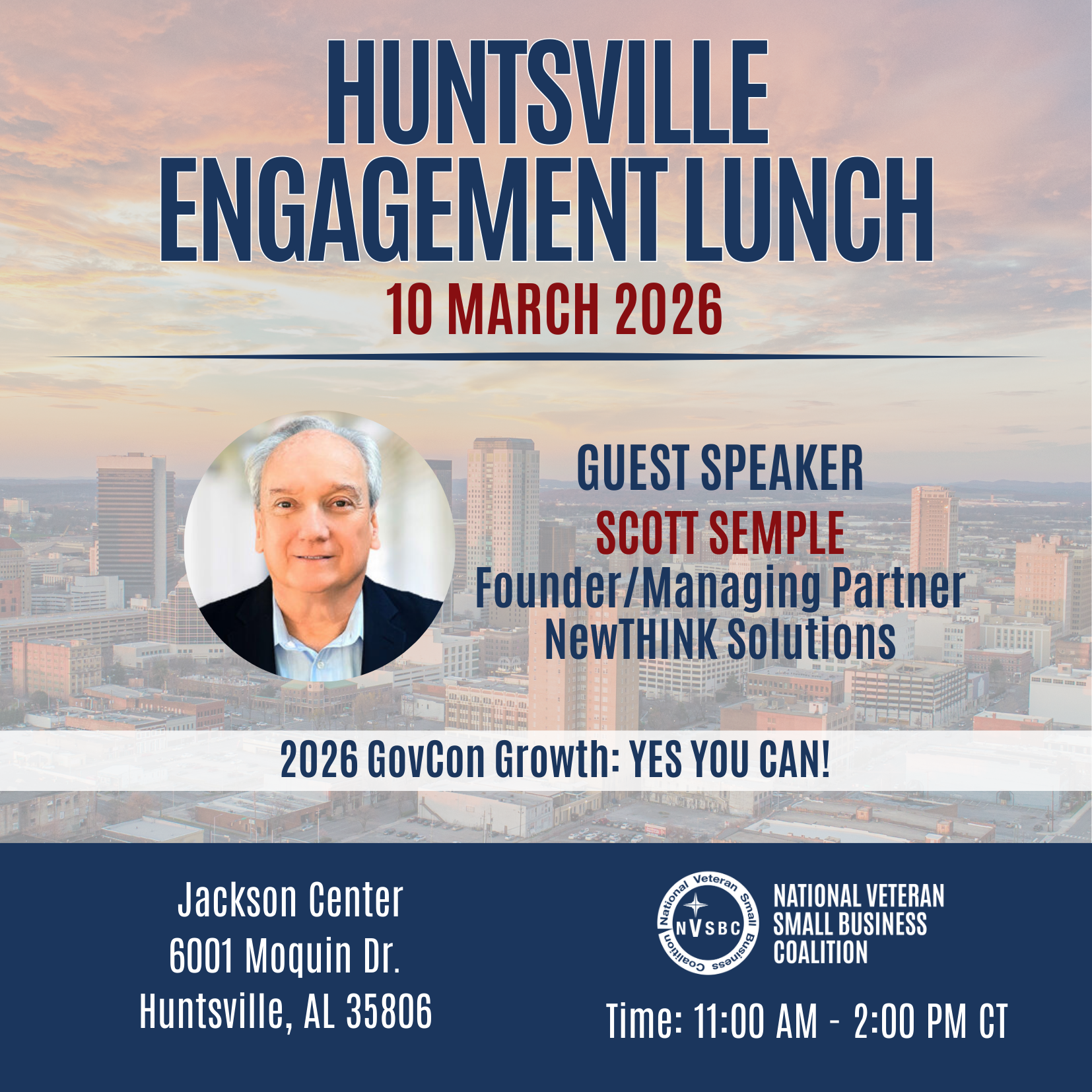 All Huntsville Engagement events are federal government contracting focused and ALL (NVSBC Members, Non-members, Veteran Owned Small Business Professionals, Veterans, etc) are welcome to attend.